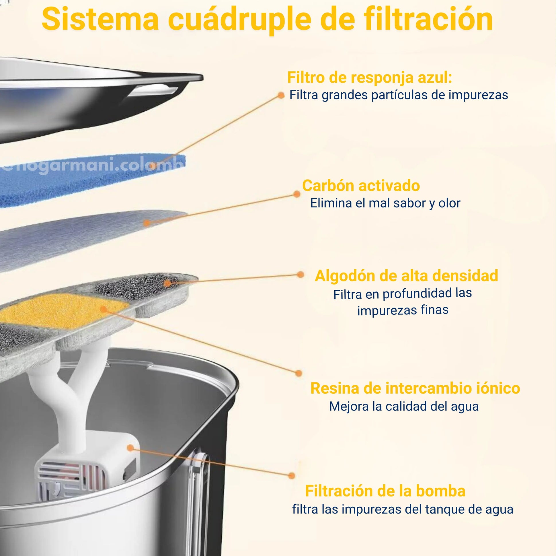 El sistema de filtración con carbón activado, resina de intercambio iónico y algodón elimina impurezas y olores, garantizando agua pura y saludable para tu mascota.